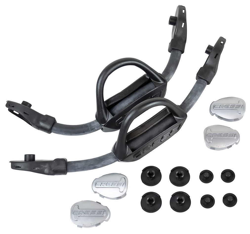 EBS SYSTEM, nuove fibbie di design essenziale ed idrodinamico, adattabili ai modelli Cressi PRO LIGHT, ARA, FROG FINS, MASTER FROG con un'innovativa striscia autoregolabile elaborata in lattice puro di alta elasticità. Il lattice è il materiale più elastico in natura e ha la proprietà di potersi allungarsi fino a 8 volte la sua longitudine senza rompersi e con totale memoria elastica, cioè, recuperando la longitudine iniziale.Permette una relazione comodità di collocazione vs. fissaggio della pinna, molto al di sopra dei sistemi di molle, precisamente per il suo alto coefficiente elastico (X8 contro X1,5 della molla).Elimina la noiosa necessità di regolazione delle fibbie tradizionali, un processo che non garantisce sempre il corretto fissaggio della tallonera, e, specialmente in sommozzatori principianti, situazioni di stress duramente la vestizione.Permette, mantenendo la comodità del battito di pinna, un alto livello di pressione sul tallone imprescindibile per ottenere una corretta trasmissione dell'energia applicata alla pinna senza perdita di energia per 'effetto molla.' Questa è senza dubbio la caratteristica più importante poiché una striscia eccessivamente soffice, lunga o senza memoria elastica riduce drasticamente l'efficienza della pinna.Assimila lo schiacciamento del neoprene del calzare durante l'immersione in profondità senza perdita di fissaggio.È facilmente ricambiable ed essenziale tanto come nella sua fabbricazione e montaggio.Il lattice naturale utilizzato è della massima qualità senza carichi che alterino le sue prestazioni e garantisce un'elevata resistenza all'uso, il salnitro e l'esposizione al sole.